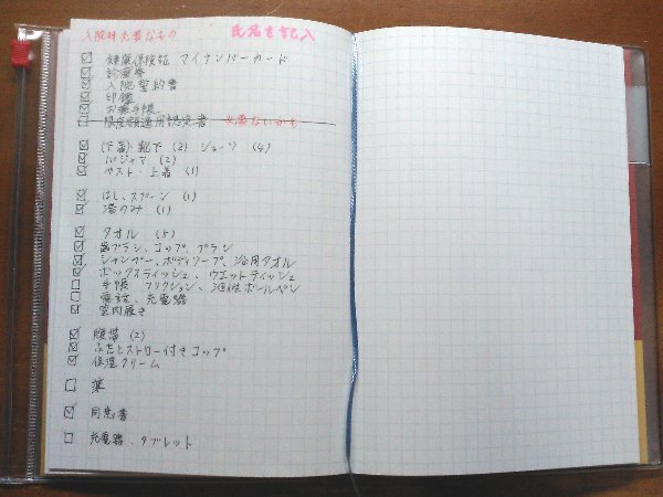 手帳に持っていく物のリストを書いて、チェックしていきました。病院で生活するわけですから結構いろいろ必要。